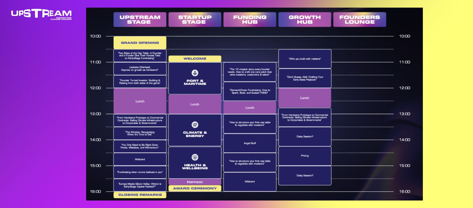 Upstream is where early-stage startups find capital and opportunities. Founders and investors are invited to join us to spark growth through funding opportunities, strategic partnerships and peer-learning. Upstream brings in some special focus on three industry tracks being, Port & Maritime, Health & Wellbeing, and Climate & Energy, while continuing to welcome innovations from all sectors. Whether you’re raising, investing, or looking to connect with peers, this community-driven festival is your gateway to meaningful connections. Save the date: May 21, 2026.